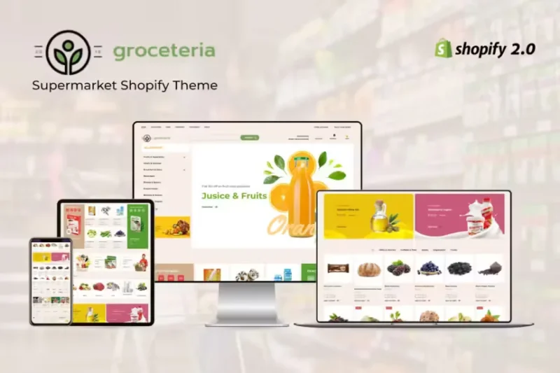 The Supermarket Shopify theme is specifically designed for grocery shops, mega stores, supermarkets, and organic shops, offering a wide range of products including beverages, vegetables, fruits, ice creams, herbs, juice, meat, sausages, soft drinks, organic foods, fresh greens, multivendor brand items, and cookies. It’s a fully customizable and mobile-friendly theme that supports Shopify login, drag-and-drop page building, and multiple languages.